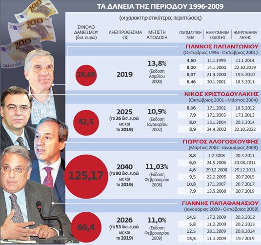 Από το 1996 ως και πρόσφατα, λίγο πριν από τις εκλογές του Οκτωβρίου του 2009, το ελληνικό κράτος, διά των παντοδύναμων τσάρων της οικονομίας, δανείστηκε υπό μορφή ομολόγων και εντόκων γραμματίων το αστρονομικό ποσόν των 260 δισ. ευρώ, ενώ μετά την κορύφωση της κρίσης και στην πορεία προς την παρ΄ ολίγον χρεοκοπία, δηλαδή μετά τις τελευταίες εκλογές, εξέδωσε επιπλέον τίτλους αξίας 27 δισ. ευρώ. Σύνολο: περί τα 290 δισ. ευρώ, με τον όγκο του χρέους να είναι λίγο πάνω από τα 300 δισ. και την ελληνική κυβέρνηση να επιβάλλει σήμερα το σκληρότερο πακέτο λιτότητας στην ιστορία της χώρας.