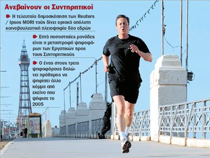 Δημοσκόπηση που δημοσιεύθηκε στον χθεσινό «Guardian» έδειξε το κόμμα του Ντέιβιντ Κάμερον να προηγείται με 33%, πέντε ποσοστιαίες μονάδες περισσότερες από τα δύο άλλα κόμματα, τους Εργατικούς του πρωθυπουργού Γκόρντον Μπράουν και τους Φιλελεύθερους Δημοκράτες του Νικ Κλεγκ που λαμβάνουν από 28% έκαστος. Για να εξασφαλίσει την πλειοψηφία στη Βουλή των Κοινοτήτων και να σχηματίσει κυβέρνηση ένα κόμμα πρέπει να λάβει τουλάχιστον 326 έδρες (επί συνόλου 650).