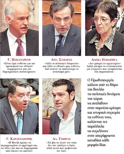 Συναίνεση για τη δημιουργία «μετώπου» κατά της βίας και υπεράσπισης της Δημοκρατίας επετεύχθη χθες στη Βουλή μεταξύ κυβέρνησης και αξιωματικής αντιπολίτευσης μετά τα δραματικά γεγονότα που κόστισαν τη ζωή στους τρεις άτυχους υπαλλήλους της Μarfin Βank στον οδό Σταδίου. Υπό τη βαριά σκιά αυτής της τραγικής εξέλιξης που συγκλόνισε το πανελλήνιο, ο πρωθυπουργός κ. Γ. Παπανδρέου κάλεσε χθες από το βήμα της Βουλής όλες τις πολιτικές δυνάμεις της χώρας να αναλάβουν στην παρούσα κρίσιμη και ιστορική συγκυρία τις ευθύνες τους, καλώντας τες παράλληλα να συγκλίνουν στην απερίφραστη καταδίκη κάθε μορφής βίας. «Με μια φωνή να στείλουμε μήνυμα ιστορικής, πολιτικής, κοινωνικής και δημοκρατικής ευθύνης και προστασίας των δικαιωμάτων του πολίτη» είπε χαρακτηριστικά, επαναφέροντας την πρότασή του για σύγκληση του Συμβουλίου Πολιτικών Αρχηγών υπό τον Πρόεδρο της Δημοκρατίας κ. Κ. Παπούλια, τονίζοντας ότι «ναι μεν υπάρχουν διαφωνίες, αλλά για βασικά ζητήματα Δημοκρατίας και απέναντι στη βία να στείλουμε το μήνυμα ότι έχουμε μια ενωμένη φωνή», πρόταση την οποία απεδέχθη απερίφραστα ο πρόεδρος της ΝΔ κ. Αντ. Σαμαράς.