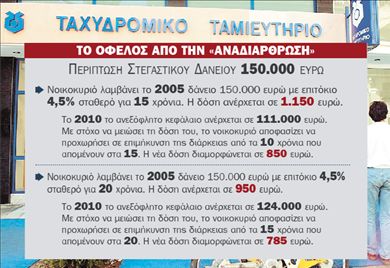 Για τις περιπτώσεις αυτές ο υφυπουργός Οικονομικών κ. Φ. Σαχινίδης βρίσκεται σε συνεννόηση με τις διοικήσεις των δύο πιστωτικών ιδρυμάτων του Δημοσίου ώστε να ανακοινωθεί σύντομα γενναία ρύθμιση, λύση με την οποία έχουν συμφωνήσει και οι ελεγκτές της Ευρωπαϊκής Ενωσης και του ΔΝΤ. Ο στόχος είναι να μειωθούν σημαντικά οι δόσεις που, όπως φαίνεται και από το παράδειγμα, μπορεί να πέσουν ως και 300 ευρώ τον μήνα για δάνεια ύψους 150.000 ευρώ που είχαν δεκαπενταετή διάρκεια.
