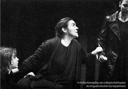 Η Λυδία Κονιόρδου στέκεται επίσης στο μεταίχμιο. Συνειδητοποιημένη ως προς το «πού» και το «τι»- τον κλειστό χώρο, τις μικρές διαστάσεις- επιδεικνύει πλήρη κυριαρχία των εκφραστικών της μέσων: μια ήρεμη δύναμη με όπλο τη λιτότητα και τη συμπύκνωση. Παρασύρεται όμως και αυτή από την παραδοσιακή φλέβα που διατρέχει το σώμα της παράστασης και τελικά δεν καταφέρνει να ξεφύγει από το παλιομοδίτικο, λαϊκό ύφος που την ανέδειξε εδώ και χρόνια στο προσκήνιο της τραγωδίας. Πόσω δε μάλλον που ο ενδυματολόγος την έντυσε σαν τη σοφή γιαγιά του χωριού- με τα μαύρα ριχτά φορέματά της, την κόκκινη μάλλινη εσάρπα και το μακρύ μπαστούνι, θα έλεγες πως είναι γραφτό να μην τινάξει ποτέ τον Τσιάνο από πάνω της.