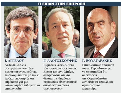 «Oύτε είδαν ούτε ξέρουν» οι πρώην κυβερνητικοί παράγοντες και συνεργάτες του κ. Κ. Καραμανλή, το όνομα των οποίων ενεπλάκη στο σκάνδαλο της Μονής Βατοπαιδίου. Στην «γραμμή» αυτή κινήθηκανχωρίς ωστόσο να αποφύγουν τις αντιφάσεις και τα αλληλοκαρφώματα- με τις καταθέσεις τους χθες στην Εξεταστική Επιτροπή της Βουλής που διερευνά την υπόθεση τόσο ο επικεφαλής του πρωθυπουργικού γραφείου επί των ημερών της ΝΔ κ. Ι. Αγγέλου όσο και ο άλλοτε «τσάρος» της Οικονομίας κ. Γ.Αλογοσκούφης, καθώς και ο κ. Γ.Βουλγαράκης με την ιδιότητα του πρώην υπουργού Πολιτισμού. Αν και το όνομα του κ. Αγγέλου είχε εμπλακεί ευθέως από τον πρώην υφυπουργό Οικονομικών κ. Π. Δούκα, αλλά και υπηρεσιακούς παράγοντες οι οποίοι ενεπλάκησαν εκ της ιδιότητάς τους στην όλη διαδικασία, όπως οι νομικοί κκ. Χρ.Μπότσιος , Σ. Γκασούκας και Σ. Ζερβουδάκης , ο ίδιος αρνήθηκε να μπει σε μια «λογική αντίκρουσης των όποιων εικασιών ή εντυπώσεων από υπονοούμενα» όπως αναφέρει χαρακτηριστικά σε γραπτό σημείωμα που προσκόμισε στην Επιτροπή.