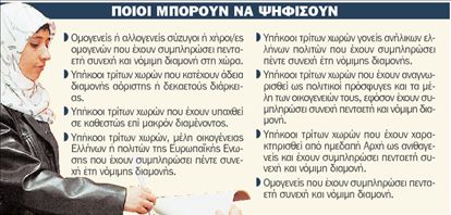 Δικαίωμα ψήφου αποκτούν οι ομογενείς και οι υπήκοοι τρίτων χωρών, εφόσον έχουν συμπληρώσει το 18ο έτος της ηλικίας τους, δεν έχουν καταδικαστεί τελεσίδικα για έγκλημα το οποίο συνεπάγεται, κατ΄ αντιστοιχία με τους έλληνες πολίτες, την αποστέρηση των πολιτικών τους δικαιωμάτων και διαμένουν επί μακρόν στην Ελλάδα. Για να ασκήσουν το δικαίωμά τους πρέπει να υποβάλουν αίτηση εγγραφής στους ειδικούς εκλογικούς καταλόγους ομογενών και αλλοδαπών τρίτων χωρών, η οποία πρωτοκολλείται από τον δήμο κατοικίας του. Ωστόσο για την εγγραφή στον κατάλογο, θεωρείται απαραίτητη η εκ μέρους του δήμου διασταύρωση των απαραίτητων στοιχείων με τα καταχωρισμένα στα ηλεκτρονικά ή άλλα αρχεία κατόχων τίτλων νόμιμης διαμονής που τηρούνται στα υπουργεία Εσωτερικών και Προστασίας του Πολίτη. Προκειμένου να είναι δυνατή η ασφαλής και άμεση διασταύρωση των απαραίτητων στοιχείων από τους δήμους, προετοιμάζεται η λειτουργία ειδικής εφαρμογής πληροφοριακού συστήματος στην οποία θα εμφανίζονται όλοι οι δικαιούχοι εγγραφής στους καταλόγους.