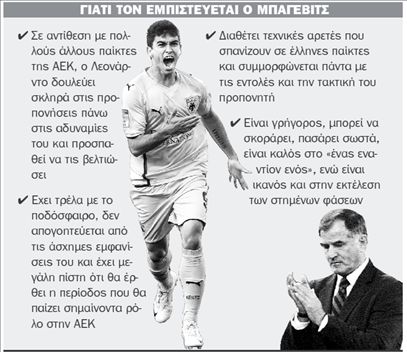 Την Κυριακή όμως ο τεχνίτης βραζιλιάνος μεσοεπιθετικός έπαιξε στα τελευταία 20 λεπτά του αγώνα με τον Αρη και επιδεικνύοντας εξαιρετική μαχητικότητα και κινητικότητα πέτυχε δύο γκολ συμβάλλοντας καθοριστικά στο να γυρίσει το ματς η ΑΕΚ (4-2 από 1-2). Ηταν τα πιο ηχηρά διαπιστευτήρια που έδωσε στον κ. Ντούσαν Μπάγεβιτς ο Λεονάρντο, ο οποίος ως τώρα έπαιζε φανερά αγχωμένος εκβιάζοντας μια πολύ καλή εμφάνιση για να ενισχύσει την πεσμένη ψυχολογία του. Ωστόσο αυτό τον άγχωνε περισσότερο, με αποτέλεσμα η απόδοσή του να χειροτερεύει και φυσιολογικά ο κ. Μπάγεβιτς (που αρχικά τον στήριξε και επέμεινε να τον χρησιμοποιεί για να βρει ρυθμό) τον τράβηξε στον πάγκο για να τον προστατεύσει. Το θετικό με την περίπτωση του Λεονάρντο είναι ότι δεν απογοητεύεται εύκολα. Σε συζητήσεις μαζί του μπορούσες εύκολα να καταλάβεις ότι το άγχος του δεν σχετιζόταν με το αν έχει ή όχι τις ικανότητες να κάνει καριέρα στην ΑΕΚ αλλά με τη σφοδρή επιθυμία του να βοηθήσει άμεσα. «Ο κόσμος περιμένει τόσα πολλά από μένα, η ομάδα έχει ανάγκη από τα γκολ και τις ασίστ μου κι εγώ δεν ανταποκρίνομαι. Με πληγώνει αυτό, δεν είναι αυτός ο αληθινός Λεονάρντο. Ξέρω καλά τις δυνατότητές μου και αυτό που προσφέρω δεν είναι ούτε το 20% από αυτό που πραγματικά μπορώ. Πρέπει να το δουλέψω μόνος μου και να βρω τη λύση » είχε παραδεχθεί παλαιότερα στο «Βήμα». Προέκυψαν και άλλα εμπόδια στην προσπάθεια της προσαρμογής του στην ΑΕΚ. Ευχάριστα ασφαλώς, αφού η γέννηση της κόρης του Νικόλι τον περασμένο Σεπτέμβριο γέμισε το σπίτι της οικογένειας με χαρούμενες φωνές την ημέρα αλλά και αρκετή… γκρίνια τις νύχτες. Ο «Λεό» για ένα αρκετά μεγάλο διάστημα δεν κοιμόταν καλά και δεν είχε τις δυνάμεις που απαιτούνταν για να ενισχύσει την ΑΕΚ. Αυτό σε συνδυασμό με την έλλειψη προετοιμασίας (έχασε όλο το βασικό στάδιο στο Ζέεφελντ της Αυστρίας) τον έφερε αρκετά πίσω και του κόστισε χρόνο συμμετοχής και αυτοπεποίθηση. Π αρ΄ όλα αυτά η παρθενική σεζόν του στην Ενωση δεν μπορεί να χαρακτηριστεί απογοητευτική. Ηταν η πρώτη του σε μια μεγάλη ομάδα με 26 (ως σήμερα) συμμετοχές σε πρωτάθλημα και πλέι οφ και τέσσερα γκολ. Ο χρόνος δουλεύει υπέρ του και οι διαφαινόμενες πωλήσεις των Νάτσο Σκόκο και Ραφίκ Τζιμπούρ αναμένεται να τον απελευθερώσουν και να τον μεταλλάξουν σε ηγέτη της νεανικής ΑΕΚ που θα χτιστεί αυτό το καλοκαίρι. * Σε διάψευση σουηδικού δημοσιεύματος σύμφωνα με το οποίο ο Ντάνιελ Μαϊστόροβιτς παραχωρείται ακόμη και ελεύθερος προκειμένου η ΑΕΚ να γλιτώσει το μεγάλο συμβόλαιό του (900.000 ευρώ ετησίως) προχώρησε χθες η ΠΑΕ. Παρ΄ όλα αυτά, όπως αποκάλυψε «Το Βήμα» το περασμένο Σάββατο, ο σουηδός στόπερ πωλείται αντί 500.000 ευρώ, ενώ στο σφυρί η ΑΕΚ θα βγάλει και τους Σκόκο, Τζιμπούρ και Ισμαελ Μπλάνκο.