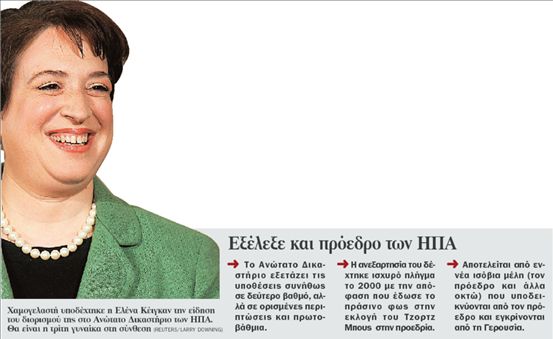 ΟΥΑΣΙΓΚΤΟΝ Την επιφανή νομικό Ελένα Κέιγκαν επέλεξε χθες ο αμερικανός πρόεδρος Μπαράκ Ομπάμα για την κενή θέση στο Ανώτατο Δικαστήριο των Ηνωμένων Πολιτειών τονίζοντας ότι πρόκειται για ένα από τα πιο λαμπρά νομικά μυαλά της χώρας. Μιλώντας στον Λευκό Οίκο και έχοντας την κυρία Κέιγκαν στο πλευρό του, ο πρόεδρος εξήρε την ευρύτητα του πνεύματός της και την ορθή της κρίση σε μια μεγάλη γκάμα νομικών θεμάτων. Η κυρία Κέιγκαν είχε διοριστεί τον Μάρτιο του 2009 από τον κ. Ομπάμα στο αξίωμα του Γενικού Εισαγγελέα (Solicitor General), θέση από την οποία εκπροσωπεί σήμερα την αμερικανική κυβέρνηση ενώπιον του Ανωτάτου Δικαστηρίου.
