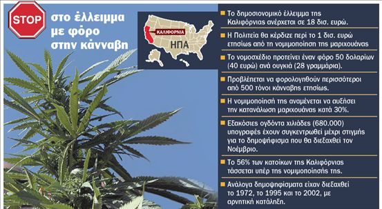 ΛΟΣ ΑΝΤΖΕΛΕΣ Μπορεί η νομιμοποίηση της μαριχουάνας να σώσει την Καλιφόρνια από τη χρεοκοπία; Μπορεί, λένε οι υπέρμαχοι της πλήρους αποποινικοποίησης, οι οποίοι θεωρούν ότι τα έσοδα από τους φόρους θα βοηθούσαν σημαντικά να αντιμετωπιστεί το τεράστιο δημοσιονομικό έλλειμμα της Πολιτείας.