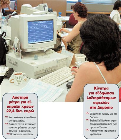 Το «όπλο» των κατασχέσεων ακινήτων, καταθέσεων, ενοικίων και άλλων περιουσιακών στοιχείων πρόκειται να χρησιμοποιήσει το υπουργείο Οικονομικών προκειμένου να εισπράξει μέρος έστω των 23,4 δισ. ευρώ που οφείλουν στο κράτος 827.396 φορολογούμενοι και επιχειρήσεις. Από την άλλη, όσοι προχωρήσουν σε εφάπαξ εξόφληση του χρέους μπορούν να έχουν έκπτωση 40% στις προσαυξήσεις της ληξιπρόθεσμης, ενώ εκείνοι που δεν έχουν τα χρήματα για άμεση εξόφληση μπορούν να ρυθμίσουν την οφειλή τους ως και σε 48 δόσεις. Ολα αυτά περιγράφονται στην εγκύκλιο του υπουργείου Οικονομικών που δόθηκε χθες στη δημοσιότητα και ουσιαστικά θέτει σε εφαρμογή διατάξεις του πρόσφατου νόμου για την άμεση είσπραξη των ληξιπρόθεσμων οφειλών που φθάνουν το 10% του Ακαθάριστου Εθνικού Προϊόντος. Οπως είχε αποκαλύψει «Το Βήμα» στις 2 Μαΐου, από το σύνολο των 23,4 δισ. ευρώ ληξιπρόθεσμων οφειλών, τα 20 δισ. ευρώ αφορούν χρέη 8.401 φυσικών και νομικών προσώπων, ενώ 602.807 φορολογούμενοι έχουν χρέη στην Εφορία κάτω από 2.000