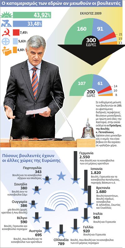 Στο πλαίσιο αυτό δεν πέρασε απαρατήρητη η θετική αποδοχή που έτυχε μεταξύ των βουλευτών η ασυνήθιστη για τα κοινοβουλευτικά ειωθότα αντίδραση του προέδρου της Βουλής κ. Φ.Πετσάλνικου, ο οποίος από το βήμα με έμμεσο αλλά σαφή τρόπο απέρριψε την πρόταση του προέδρου της ΝΔ, παραθέτοντας στοιχεία για να υποστηρίξει την άποψη ότι η χώρα μας δεν έχει… υπεράριθμους βουλευτές σε αναλογία με άλλες ευρωπαϊκές χώρες, στην πλειονότητα των οποίων συνυπάρχουν περισσότερα του ενός νομοθετικά σώματα με τη μορφή είτε της Ανω Βουλής είτε της Γερουσίας ή και περιφερειακών κοινοβουλίων. Επιπλέον ο κ. Πετσάλνικος για να υπερασπιστεί τη θέση του επιχειρηματολόγησε υποστηρίζοντας ότι το συνολικό κόστος της λειτουργίας του Κοινοβουλίου είναι 3,5 τοις χιλίοις των συνολικών δαπανών του κρατικού προϋπολογισμού, ενώ οι αμοιβές των σημερινών «300» αντιπροσωπεύουν το 1 τοις χιλίοις.