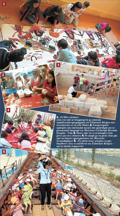 Για το Σάββατο 22 Μαΐου προτείνεται το πρόγραμμα «Ο Μiro γλύπτης» και για τις 23 Μαΐου τα προγράμματα «Τα πλοία έχουν ιστορίες να μας δηγηθούν» και «Ανασκαφή για όλους… μικρούς και μεγάλους». (Το κόστος της συμμετοχής είναι 8,5 ευρώ για κάθε παιδί). Το πιο πρωτότυπο πρόγραμμα όμως που προτείνει ο «Ελληνικός Κόσμος» δεν είναι άλλο από μια εναλλακτική κατασκήνωση με τίτλο «Καλοκαίρι στην πόλη». Για δύο εβδομάδες, από Δευτέρα ως Παρασκευή, παιδιά ηλικίας 5-12 ετών θα συμμετάσχουν σε ένα πολυθεματικό εκπαιδευτικό πρόγραμμα εντός του Ελληνικού Κόσμου με προβολές, εκθέσεις και διάφορες άλλες δραστηριότητες. Το «Καλοκαίρι στην πόλη 2010» υλοποιείται σε τέσσερα δεκαήμερα και περιλαμβάνει δύο θεματικές ενότητες. Η πρώτη έχει τίτλο «Κουπί γοργά, πόλεις μας περιμένουν» (21/6-2/7 και 19-30/7) και η δεύτερη «Σκάψε, σκάψε, μύθους θα βρεις» (5-16/7 και 23/8-3/9).