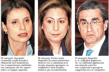 Στο υπουργείο Εργασίας, όπως βεβαιώνει ο υπουργός κ. Α. Λοβέρδος, «οι υπάλληλοι βρίσκονται στα κάγκελα γιατί δεν τους εγκρίνεται η μειωμένη συμμετοχή τους σε επιτροπές». Ακόμη για πρώτη φορά εδώ και πολλά χρόνια όλοι οι υπάλληλοι του υπουργείου μετείχαν στην απεργία της ΑΔΕΔΥ.