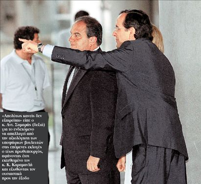 «Απολύτως κανείς δεν εξαιρείται» διασαφήνισε ο κ. Σαμαράς μετά τη χθεσινή συνάντησή του με τον πρόεδρο της ΚΟ του ΣΥΡΙΖΑ κ. Αλ.Τσίπρα , απαντώντας στις επίμονες ερωτήσεις των δημοσιογράφων, αν αυτή η αξιολόγηση αφορά και τον κ. Καραμανλή. Οι «καραμανλικοί» βουλευτές και στελέχη θεωρούν ότι πλέον ο κ. Σαμαράς αφήνει «ακάλυπτο» τον τέως πρωθυπουργό αλλά και τους ίδιους απολύτως εκτεθειμένους.