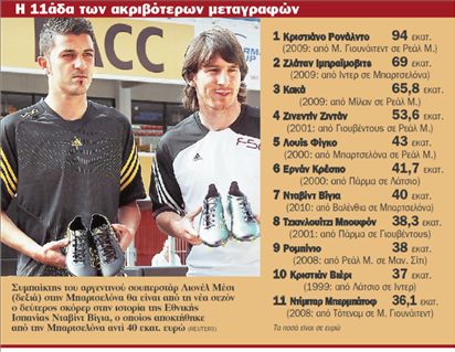 Δεν πρόλαβαν να κοπάσουν οι πανηγυρισμοί για την κατάκτηση του δεύτερου συνεχόμενου πρωταθλήματος Ισπανίας στη Βαρκελώνη και η Μπαρτσελόνα ξεκίνησε τον χορό των μεταγραφών, ανακοινώνοντας την απόκτηση του γκολτζή της Βαλένθια Νταβίντ Βίγια, ο οποίος είναι δεύτερος σκόρερ (με 36 τέρματα σε 55 ματς) στην ιστορία της Εθνικής Ισπανίας πίσω από τον Ραούλ της Ρεάλ που έχει πετύχει 44 γκολ. Οι Μπλαουγκράνα, οι οποίοι δαπάνησαν πέρυσι περίπου 50 εκατ. ευρώ (συν τον Σάμουελ Ετό που κοστολογήθηκε 20 εκατ. ευρώ) για την απόκτηση του Ζλάταν Ιμπραΐμοβιτς, έβγαλαν από το ταμείο τους 40 εκατ. ευρώ εφέτος για τον 28χρονο Βίγια, ο οποίος με 21 γκολ ήταν για πέμπτη συνεχόμενη χρονιά πρώτος σκόρερ της Βαλένθια.