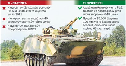 Την ίδια στιγμή, η προμήθεια των ρωσικών ΤΟΜΑ ΒΜΡ-3 επίσης παγώνει. Η ρωσική πλευρά εμφανίζεται σύμφωνα με πληροφορίες να πιέζει για σεβασμό της υπάρχουσας συμφωνίας, αλλά αυτό δύσκολα θα μεταβάλει τις προτεραιότητες της Αθήνας.