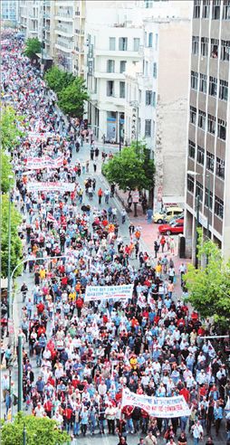 Την έντονη αποδοκιμασία των απεργών δέχθηκαν τα κυβερνητικά μέτρα για τις αλλαγές στο ασφαλιστικό σύστημα κατά τη χθεσινή μαζική γενική απεργία που διοργάνωσαν η ΓΣΕΕ και η ΑΔΕΔΥ. Στις δύο συγκεντρώσεις που πραγματοποίησαν οι τριτοβάθμιες οργανώσεις στο Πεδίον του Αρεως και το Πανεργατικό Αγωνιστικό Μέτωπο (ΚΚΕ) στην πλατεία Ομονοίας πήραν μέρος χιλιάδες εργαζόμενοι και συνταξιούχοι, ενώ, σύμφωνα με τα στοιχεία των συνδικάτων, η συμμετοχή στην απεργία ξεπέρασε το 70% και σε πολλές περιπτώσεις επιχειρήσεων άγγιξε το 100%. Στο ψήφισμα της συγκέντρωσης τα συνδικάτα υπογραμμίζουν ότι τα μέτρα είναι ακραία και πλήττουν εργαζόμενους, συνταξιούχους, αλλά και τις μελλοντικές γενιές. Οι οργανώσεις προσδιορίζουν τις απώλειες για τις συντάξεις να φθάνουν ως και στο 15%, ενώ εκτιμούν ότι η αύξηση των ετών ασφάλισης που επιφέρει το νομοσχέδιο ξεκινά από δύο και φθάνει στα επτά έτη.