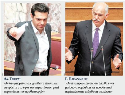 Μετωπική σύγκρουση ανάμεσα στον κ. Γ. Παπανδρέου και στον κ. Αλ. Τσίπρα προκάλεσε χθες στη Βουλή στο πλαίσιο της «Ωρας του Πρωθυπουργού» η συζήτηση γύρω από τις κοινωνικές επιπτώσεις των μέτρων της κυβέρνησης στο πλαίσιο της εφαρμογής του μηχανισμού στήριξης ΕΕ- ΔΝΤ. Ο πρόεδρος της ΚΟ του ΣΥΡΙΖΑ επιτέθηκε σφοδρά κατά του Πρωθυπουργού, λέγοντάς του ότι δεν μπορεί «να παριστάνει τον πρωθυπουργό» αν δεν μπορεί να εγγυηθεί τίποτε στους έλληνες πολίτες, ενώ ο κ. Παπανδρέου τον κατηγόρησε ότι «τα παρουσιάζει όλα μαύρα». Ο κ. Παπανδρέου παραδέχτηκε ότι η κυβέρνηση έλαβε «πολύδύσκολες αποφάσεις» και ότι «κάποιες μάλιστα εμπεριέχουν την αδικία, αφού κλήθηκαν να πληρώσουν τα σπασμέναπολίτες που δεν έφεραν καμία ευθύνη ή έφεραν λιγότερες ευθύνες για τη σημερινή κατάσταση».