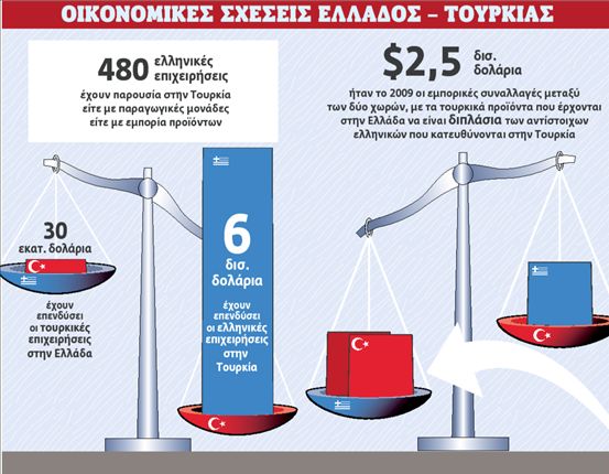 Οι εμπορικές συναλλαγές των δύο χωρών ανέρχονται σε περίπου 3,7 δισ. δολάρια ετησίως, αν και το 2009 λόγω της κρίσης περιορίστηκαν στα 2,5 δισ. δολάρια, με αναλογία 2 προς 1 υπέρ της Τουρκίας. Σήμερα 480 ελληνικές επιχειρήσεις δραστηριοποιούνται στην Τουρκία, με την επένδυση της Finansbank να ξεχωρίζει, ενώ εκτός από την Ιntralot και τον Νηρέα σημαντικές επενδύσεις έχει πραγματοποιήσει και το Θεραπευτήριο Υγεία.