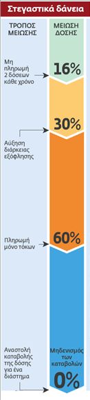 Νοικοκυριό χρωστά στην τράπεζα 120.000 ευρώ για δάνειο που λήγει σε 15 χρόνια, ενώ το επιτόκιό του φθάνει το 4,5%. Η μηνιαία δόση ανέρχεται σε 920 ευρώ. Αν επιλεγεί η πληρωμή μόνο τόκων για ένα διάστημα, π.χ., 3 ετών, η δόση του δανείου για αυτά τα τρία έτη θα πέσει στα 450 ευρώ, δηλαδή χαμηλότερα κατά 50%. Ωστόσο, μετά τα τρία αυτά χρόνια, το νοικοκυριό θα χρωστά εκ νέου 120.000