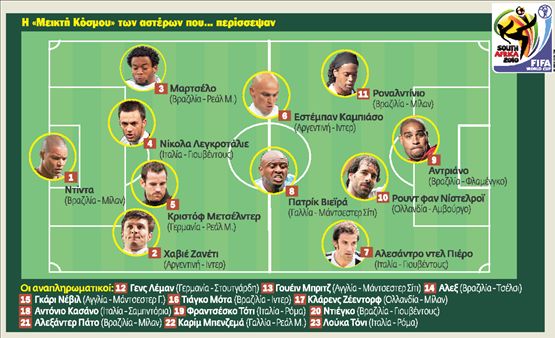 ΜΙΑ ΠΛΗΡΗομάδα (με ρόστερ δύο 11άδων) ικανή να διεκδικήσει με αξιώσεις τον τίτλο της παγκόσμιας πρωταθλήτριας συγκροτούν οι ποδοσφαιριστές-μεγάλα ονόματα διεθνώς που κόπηκαν από το Μουντιάλ της Ν. Αφρικής (11 Ιουνίου- 11 Ιουλίου). Ποτέ στο παρελθόν δεν έγινε τόσο μεγάλη… σφαγή από τις προεπιλογές ακόμη των ομοσπονδιακών