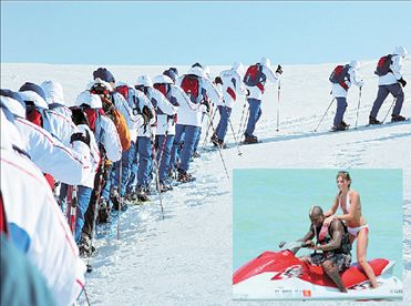 Τελικά οι ποδοσφαιριστές (φαίνεται ότι) είναι περίεργοι άνθρωποι. Παράδειγμα, ο πρώτος σκόρερ του Παναθηναϊκού και του ελληνικού πρωταθλήματος Τζιμπρίλ Σισέ (ένθετη φωτογραφία, με τη σύζυγό του Τζουντ ) ο οποίος, αντί να χαίρεται το τζετ σκι στις ελληνικές θάλασσες, μόχθησε για να πάρει μια θέση στην Εθνική Γαλλίας με αποτέλεσμα τελικά… να πάρει τα βουνά! Αυτή την εποχή οι Τρικολόρ προετοιμάζονται στο προπονητικό κέντρο της Τιν, στις γαλλικές Αλπεις, προκειμένου να προσαρμοστούν στα υψόμετρα που θα συναντήσουν στο Μουντιάλ της Νότιας Αφρικής. Ο Σισέ είναι ένας εκ των σκιέρ της μεγάλης φωτογραφίας που δεν είναι άλλοι από τους παίκτες της Εθνικής Γαλλίας οι οποίοι φορτωμένοι με… γυλιούς ανεβαίνουν το βουνό, όπως επιτάσσουν οι πρωτοποριακές προπονητικές μέθοδοι του γάλλου ομοσπονδιακού τεχνικού κ. Ραϊμόν Ντομενέκ.