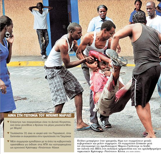 Χιλιάδες βαριά οπλισμένοι αστυνομικοί και στρατιώτες από τη μία και κουκουλοφόροι κακοποιοί από την άλλη έχουν μετατρέψει σε πεδίο μάχης τις τελευταίες τρεις ημέρες τις βιαιότερες φτωχογειτονιές της τζαμαϊκανικής πρωτεύουσας, Κίνγκστον. Οι μάχες συνεχίστηκαν για τρίτη ημέρα χθες με επίκεντρο το Δυτικό Κίνγκστον, τη γενέτειρα του θρύλου της μουσικής ρέγκε Μπομπ Μάρλεϊ.