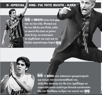 φορ που τα έχει όλα. Φυσικά και θα τον ήθελα στη Ρεάλ, αλλά το σωστό θα είναι να μείνει στην Ιντερ, να ανανεώσει το συμβόλαιό του εκεί και να βγάλει περισσότερα λεφτά. Ο Μαϊκόν είναι ένα θαύμα της φύσης, πολύ ποιοτικός ποδοσφαιριστής, ο οποίος πετυχαίνει 6-7 γκολ κάθε σεζόν. Δεν λέω ότι δεν θα τον ήθελα, αλλά θεωρώ ότι ο Σέρχιο Ράμος μπορεί να γίνει ο κορυφαίος δεξιός μπακ στον κόσμο. Ο Ντι Μαρία είναι επίσης ένας φανταστικός παίκτης, αλλά αγωνίζεται σε ένα μικρότερο πρωτάθλημα \344 Το αν ο γιος του εξακολουθεί να υποστηρίζει την Μπαρτσελόνα: «Ο γιος μου παλαιότερα υποστήριζε την Μπαρτσελόνα, τώρα όμως είναι οπαδός της ομάδας που δουλεύει ο πατέρας του και της ομάδας που σέβεται τον πατέρα του. Δεν μπορεί να υποστηρίζει μια ομάδα της οποίας οι οπαδοί έβριζαν τον πατέρα του για 90 λεπτά. Δεν έχω κανένα πρόβλημα με τον Γκουαρντιόλα. Τον γνωρίζω πολλά χρόνια, έχουμε εξαιρετική σχέση και τον σέβομαι πολύ» .