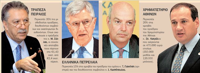 Ενα από τα παραδείγματα αυτοπερικοπής αμοιβών σημειώθηκε εφέτος στα Ελληνικά Πετρέλαια, όπου υπάρχει μετοχικός συνεταιρισμός Δημοσίου, ιδιώτη, θεσμικών επενδυτών. Οι επικεφαλής αποφάσισαν να μειώσουν κατά 15% τις αμοιβές τους και αποποιήθηκαν ολοσχερώς τα μπόνους.