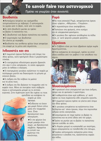 «Oδηγός συμπεριφοράς της Ελληνικής Αστυνομίας προς θρησκευτικές και ευάλωτες κοινωνικές ομάδες». Αυτός είναι ο τίτλος του 36σέλιδου φυλλαδίου το οποίο αυτή την περίοδο βρίσκεται στο τυπογραφείο και σε σύντομο χρονικό διάστημα θα πάρουν στα χέρια τους οι αστυνομικοί που υπηρετούν σε όλη την Ελλάδα αλλά και οι δόκιμοι που ακόμα σπουδάζουν στις Σχολές της ΕΛ.ΑΣ.