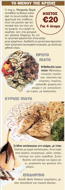 Oυρά αστακού ογκρατέν για τον Ρετζέπ Ταγίπ Ερντογάν , στρείδια και φουά γκρα για τον Φρανσουά Μιτεράν, σφυρίδα για την κυρία Ντόρα Μπακογιάννη , κρουασάν και λαδερά φασολάκια για τους σπουδαστές του Γαλλικού Ινστιτούτου. Ολα, διά χειρός Ντομινίκ Περό, του γάλλου σεφ που ταΐζει γνωστούς, λιγότερο γνωστούς και παντελώς αγνώστους τα τελευταία 20 χρόνια στην Ελλάδα.