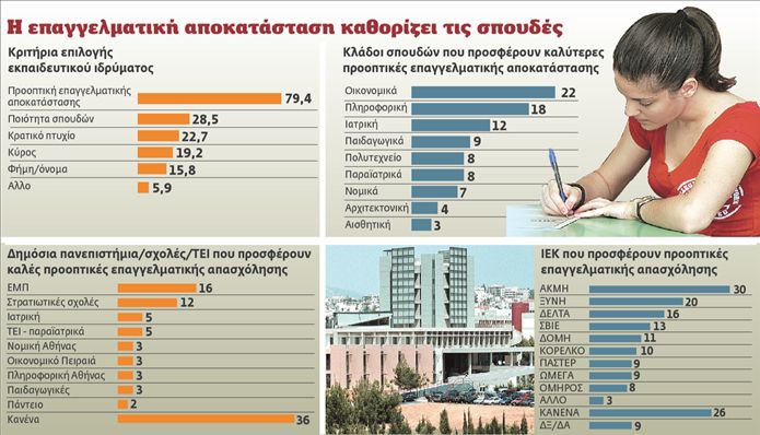 * Θεωρούν τα Οικονομικά ως τον κύκλο σπουδών με τις μεγαλύτερες προοπτικές επαγγελματικής αποκατάστασης, ενώ ακολουθούν η Πληροφορική, η Ιατρική και παραϊατρικά επαγγέλματα, τα Παιδαγωγικά, οι Στρατιωτικές Σχολές.