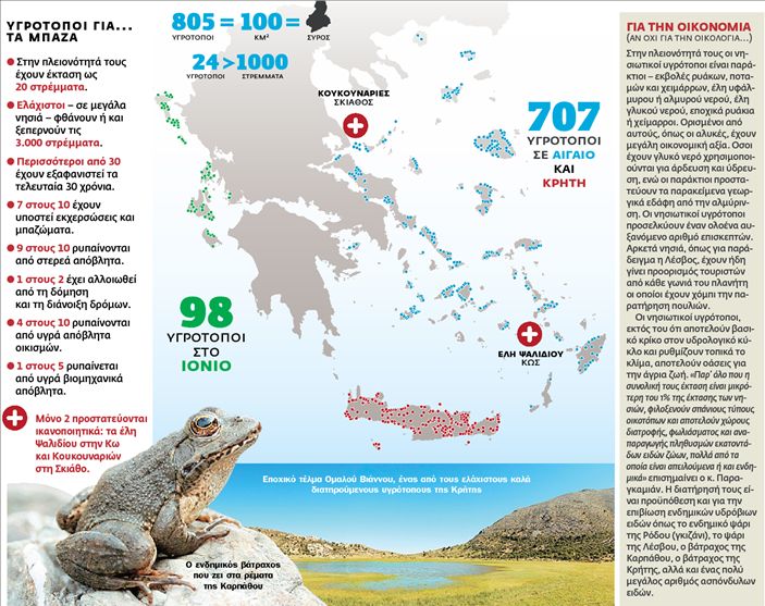 Από τις 805 υγροτοπικές εκτάσεις που υπάρχουν σήμερα σε 83 νησιά του Αιγαίου και του Ιονίου πελάγους, περίπου οι μισές απειλούνται ή κινδυνεύουν άμεσα με καταστροφή. Ενας στους δύο… Οπως αναφέρει ο επιστημονικός υπεύθυνος του προγράμματος του WWF για τους υγροτόπους, βιολόγος κ. Καλούστ Παραγκαμιάν , παρ΄ όλο που πολλοί απ΄ αυτούς βρίσκονται εντός των ορίων προστατευόμενων περιοχών- Μνημεία της Φύσης, Δίκτυο Φύση 2000, Σημαντικές Περιοχές για τα Πουλιά, Καταφύγια Αγριας Ζωής κ.ά.- μόνο δύο προστατεύονται ικανοποιητικά και έχουν σχετικά επαρκή περιβαλλοντική διαχείριση. Πρόκειται για το έλος Ψαλιδίου στην Κω και το έλος Κουκουναριών στη Σκιάθο. «Ιδιαίτερα οι μικροί υγρότοποι είναι σήμερα τα περισσότερο απειλούμενα οικοσυστήματα στο Αιγαίο και φαίνεται ότι αρκετοί από αυτούς θα εξαφανιστούν προτού θεσπιστεί το νομικό πλαίσιο προστασίας και γίνουν αποτελεσματικοί οι μηχανισμοί εφαρμογής του» σημειώνει ο κ. Παραγκαμιάν.
