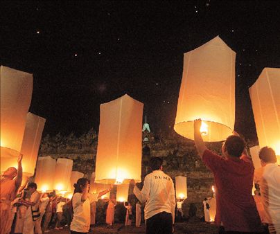 Μοναχοί και πιστοί βουδιστές αφήνουν ελεύθερα χιλιάδες παραδοσιακά φανάρια για να γιορτάσουν το «Βέσακ», τα γενέθλια του πρίγκιπα Σιντάρτα Γκαουτάμα, που έγινε «Πεφωτισμένος» (Βούδας), και εορτάζονται την πρώτη πανσέληνο κάθε Μαΐου. Το στιγμιότυπο είναι από βουδιστικό ναό στο Μαγκελάγκ της Ινδονησίας. Οι πιστοί επαναλαμβάνουν όρκους ταπεινότητας και αναζήτησης της νιρβάνα