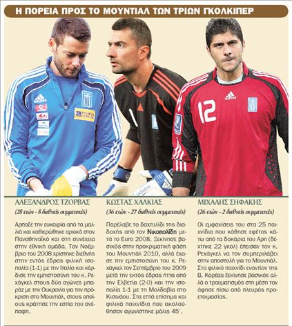 Η Ελλάδα παρουσίασε το 1994 στο Μουντιάλ των ΗΠΑ τη χειρότερη άμυνα στη φάση των ομίλων, με 10 γκολ παθητικό. Ως εκ τούτου το ερώτημα ποιος από τους Κώστα Χαλκιά, Αλέξανδρο Τζόρβα και Μιχάλη Σηφάκη θα υπερασπιστεί το Σάββατο την εστία της Εθνικής στον αγώνα με τη Ν. Κορέα μόνο ρητορικό δεν είναι. Ο κ. Οτο Ρεχάγκελ δείχνει να εμπιστεύεται τον Τζόρβα, αλλά επισήμως δεν έχει ανοίξει τα χαρτιά του. Στο φιλικό με τη Β. Κορέα (2-2) ξεκίνησε βασικός ο Σηφάκης, ενώ ο Τζόρβας έπαιξε στο επόμενο φιλικό με την Παραγουάη (0-2). Αντίθετα ο Χαλκιάς παρακολούθησε και τα δύο παιχνίδια από τον πάγκο. Στη χθεσινή προπόνηση ο Τζόρβας αγωνίστηκε με την ομάδα που ως προς το αμυντικό της σκέλος αποτελούνταν από τους λεγόμενους αναπληρωματικούς, ενώ ο Χαλκιάς με την ομάδα των βασικών αμυντικών.