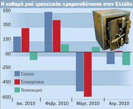 Σύμφωνα με τα επίσημα στοιχεία της Τράπεζας της Ελλάδος, μέσα στους πρώτους τέσσερις μήνες του 2010 τα κεφάλαια που έφθασαν στην αγορά, αν αφαιρεθούν τα δάνεια που αποπληρώθηκαν, διαμορφώθηκαν μόλις σε 84 εκατ. ευρώ. Πρόκειται για υποχώρηση που ξεπερνά σε ετήσια βάση το 90%, καθώς την αντίστοιχη περίοδο του 2009 το ίδιο μέγεθος είχε ανέλθει στα 962 εκατ. ευρώ. Η καθαρή ροή χρηματοδότησης των επιχειρήσεων ανήλθε το υπό εξέταση χρονικό διάστημα σε 187 εκατ. ευρώ, ενώ οι δανειοδοτήσεις των ιδιωτών διαμορφώθηκαν σε αρνητικά επίπεδα (-103 εκατ. ευρώ). Τον Απρίλιο ο ρυθμός πιστωτικής επέκτασης έπεσε στο 3,2% από 3,5% τον Μάρτιο του 2010 και 4,2% τον Δεκέμβριο του 2009 και οδεύει ολοταχώς προς μηδενικά επίπεδα.