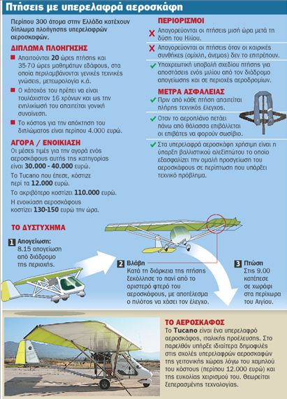 Με τον όρο υπερελαφρά χαρακτηρίζονται αποκλειστικά τα διθέσια αεροπλάνα με βάρος απογείωσης ως 550 κιλά- στο οποίο περιλαμβάνεται και αυτό επιβατών και αποσκευών. «Πιστεύω ότι αποτελούν το μέλλον της αεροπλοΐας, αφού έχει αποδειχθεί ότι υπερέχουν σε σχέση με τα ελαφρά τόσο από πλευράς επιδόσεων όσο και από πλευράς ασφαλείας» σημειώνει ο ιδιοκτήτης σχολής υπερελαφρών αεροσκαφών κ. Αρης Πετίτσας. «Οι πτήσεις με υπερελαφρά αεροσκάφη κερδίζουν όλο και περισσότερους φίλους στην Ελλάδα, αφού αποτελούν μια φθηνότερη εναλλακτική λύση σε σχέση με τα τετραθέσια ελαφρά. Αυτή τη στιγμή λειτουργούν 13 σχολές, ενώ περίπου 300 Ελληνες κατέχουν άδεια πλοήγησης» τονίζει.