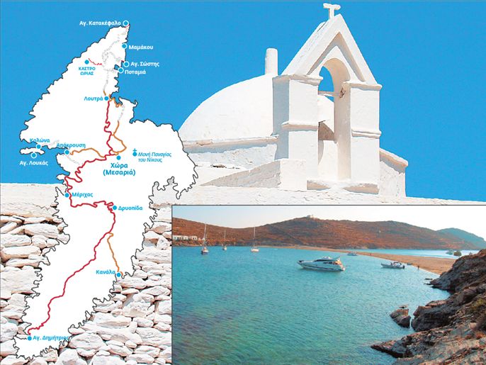 Από τα Λουτρά ξεκινήσαμε την περιπλάνηση για την αναζήτηση του κάστρου της Ωριάς. Περίπου 300 μέτρα πριν από τη διασταύρωση του χωματόδρομου για Αγιο Σώστη υπάρχει πινακίδα που δείχνει έναν δύσκολο χωματόδρομο προς Κατακέφαλο. Αφήσαμε το αυτοκίνητο και τον ακολουθήσαμε με τα πόδια ως την… άκρη του νησιού (περίπου 1 ώρα). Είχαμε κάνει λάθος, δεν βρήκαμε το Κάστρο της Ωριάς, αλλά πολλά σημεία πανοραμικής θέας της απρόσιτης παραλίας Μαμάκου, όλης της ακτογραμμής και του πελάγους ως την Τζια. Το κάστρο το είχαμε προσπεράσει. Περίπου 3,5 χλμ. ασφάλτου από τα Λουτρά και μόνο 800 μέτρα χωματόδρομου υπάρχει πινακίδα που δείχνει αριστερά το μονοπάτι, σηματοδοτημένο με αραιά κόκκινα σημάδια. Μισή ώρα πεζοπορίας είναι αρκετή για να βρεθείς σε ένα εντυπωσιακά άγριο τοπίο με βράχινους «πύργους», που στην κορυφή του πιο ψηλού στέκουν τα ερείπια του κάστρου και ανάμεσά τους το λευκό εκκλησάκι της Παναγιάς. Η θέα κάτω στην ακτογραμμή είναι φοβερή, καθώς στα ανοιχτά πηγαινοέρχονται γρήγορα και βραδυπορούντα πλοία. Η αναζήτηση άξιζε τον κόπο.