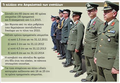 Σύνταξη σε ηλικία 60 ετών ή έπειτα από 40 χρόνια υπηρεσίας (35 πραγματική και πέντε πλασματική) θα παίρνουν από το 2015 οι στρατιωτικοί, όπως προβλέπεται στο σχέδιο νόμου για την ιεραρχία και τις προαγωγές στις Ενοπλες Δυνάμεις που παρουσίασε χθες ο υπουργός Εθνικής Αμυνας κ. Ευ. Βενιζέλος. Παράλληλα θεσπίζεται η διπλή επετηρίδα και μειώνεται σε 15 από 18 μήνες η θητεία για τους αντιρρησίες συνείδησης, ενώ εκτός από τις βασικές διατάξεις για την υπηρεσιακή εξέλιξη και ιεραρχία των στελεχών των ΕΔ, ανακοινώθηκε η νέα δομή διοίκησης του Στρατεύματος.