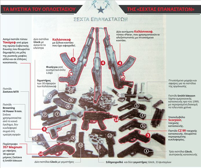 Το οπλοστάσιο της «Σέχτας Επαναστατών» είναι πραγματικό και έτοιμο να σκορπίσει πάλι τον τρόμο! Κανένα από τα 17 όπλα της οργάνωσης που απεικονίζονται στη φωτογραφία που συνόδευσε την επτασέλιδη προκήρυξη μετά τη δολοφονία του Σωκράτη Γκιόλια δεν είναι ρεπλίκα, όπως υπέθεσαν αρχικά ορισμένοι αξιωματικοί της ΕΛ.ΑΣ. Η οργάνωση ποτέ δεν μπλόφαρε με ψεύτικα όπλα, τα οποία είχαν μπει στο κάδρο του οπλοστασίου «για λόγους εντυπωσιασμού», όπως εκτιμήθηκε αρχικά με την ελπίδα να καθησυχαστούν οι ανησυχίες πρωτίστως της ίδιας της Αστυνομίας για το μέγεθος του προβλήματος. Πιθανολογείται μάλιστα ότι ο άτυχος δημοσιογράφος πυροβολήθηκε από τα δύο πιστόλια, ένα Glock και ένα CΖ 99, τσεχικής κατασκευής, που φαίνονται στη φωτογραφία.
