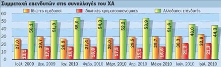 Η άνοδος του Γενικού Δείκτη τον Ιούλιο κατά 17,2% και των συναλλαγών κατά 3% που διαμορφώθηκαν στα 2,3 δισ. ευρώ είχε ελληνικό άρωμα. Σύμφωνα με τα στοιχεία του Κεντρικού Αποθετηρίου, οι έλληνες επενδυτές ήταν αγοραστές με καθαρές εισροές 88 εκατ. ευρώ, ενώ οι ξένοι ήταν πωλητές με καθαρές εκροές 86,1 εκατ. ευρώ. Αποτέλεσμα ήταν η συμμετοχή των ξένων επενδυτών στη συνολική κεφαλαιοποίηση της ελληνικής αγοράς να περιοριστεί στο 48,5% σε σχέση με 49,4% τον Ιούνιο.