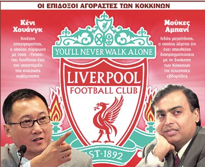 Σε μάχη μεταξύ Κίνας και Ινδίας φαίνεται ότι οδηγείται η περίφημη αγοραπωλησία της Λίβερπουλ, καθώς στην κούρσα των επίδοξων αγοραστών μετά τον κινέζο επιχειρηματία κ. Κένι Χουάνγκ μπήκε και ο μεγιστάνας κ. Μούκες Αμπανί (φέρει τον τίτλο του πλουσιότερου Ινδού), ο οποίος μαζί με τον συμπατριώτη του επιχειρηματία κ. Σουμπράτα Ρόι λέγεται ότι έχει καταθέσει επίσημη πρόταση για την αγορά του καταχρεωμένου αγγλικού συλλόγου που από τον Φεβρουάριο του 2007 ανήκει στους Αμερικανούς κκ. Τομ Χικς και Τζορτζ Τζίλετ. Σύμφωνα πάντως με όσα αποκάλυψαν χθες οι «Τimes» του Λονδίνου, ο κ. Χουάνγκ υποστηρίζεται (και) από τον κρατικό μηχανισμό της Κίνας στο πλάνο για την αγορά των Ρεντς, καθώς μέρος του ποσού που θέλει να επενδύσει στους Κόκκινους προέρχεται από την κινεζική κυβέρνηση! Οπως αναφέρεται στο σχετικό ρεπορτάζ, η China Ιnvestment Corporation (εταιρεία που έχει συσταθεί από την Κίνα για να διαχειριστεί τα κεφαλαία του κινεζικού κράτους τα οποία αφορούν επενδύσεις στο εξωτερικό) προτίθεται να δώσει σημαντικό μέρος από τα 237 εκατ. ευρώ που είναι το χρέος της Λίβερπουλ. Ωστόσο, σύμφωνα με τους «Financial Τimes», πηγές από την εταιρεία CΙC ανέφεραν ότι «δεν γνωρίζουν τίποτε για την εξαγορά της Λίβερπουλ, ούτε για τον Χουάνγκ». Εν αναμονή λοιπόν… Οσον αφορά γενικότερα την αγγλική Πρέμιερσιπ που αρχίζει το Σαββατοκύριακο 14-15 Αυγούστου, σημειώνεται ότι στο πρωτάθλημα θα εφαρμοστεί μοντέλο Τσάμπιονς Λιγκ για τη συμμετοχή (κυρίως) γηγενών ταλαντούχων ποδοσφαιριστών με απώτερο στόχο τη μείωση των αλλοδαπών στο κατά πολλούς κορυφαίο πρωτάθλημα του κόσμου. Συγκεκριμένα, από τους 25 παίκτες που θα δηλώνει κάθε ομάδα και θα έχει δικαίωμα να χρησιμοποιήσει, τουλάχιστον οι 8 θα πρέπει να έχουν συμπληρώσει 36 μήνες παρουσίας στα αγγλικά γήπεδα ως την ηλικία των 21 ετών.