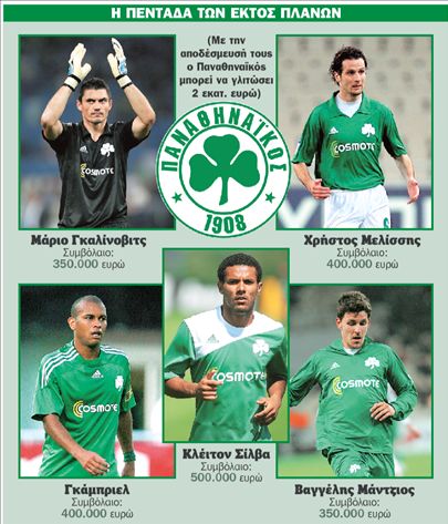 Η απαλλαγή από τα συμβόλαια όσων παικτών δεν υπολογίζονται από τον προπονητή του Παναθηναϊκού κ. Νίκο Νιόπλια αποτελεί επί του παρόντος τον μεγαλύτερο βραχνά της διοίκησης του Τριφυλλιού. Οι Πράσινοι έχουν στο δυναμικό τους πέντε ποδοσφαιριστές τους οποίους προσπαθούν (για αρκετό καιρό) είτε να πουλήσουν είτε να παραχωρήσουν με δανεισμό προκειμένου να ελαφρύνουν το μπάτζετ της ομάδας κατά 2 εκατ. ευρώ! Το ποσό αυτό προκύπτει από τα συμβόλαια που έχουν υπογράψει με τον Παναθηναϊκό ο κροάτης γκολκίπερ Μάριο Γκαλίνοβιτς (350.000 ευρώ), ο στόπερ Χρήστος Μελίσσης (400.000 ευρώ), ο βραζιλιάνος δεξιός μπακχαφ Γκάμπριελ (400.000 ευρώ), ο βραζιλιάνος επιτελικός μέσος Κλέιτον Σίλβα (500.000 ευρώ) και ο σέντερ φορ Βαγγέλης Μάντζιος (350.000 ευρώ).