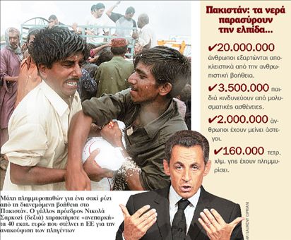 ΠΑΡΙΣΙ Τη συγκρότηση ειδικής στρατιωτικής δύναμης για τη βοήθεια των πληγέντων από θεομηνίες εξετάζει η Ευρωπαϊκή Ενωση μετά τις σφοδρές επικρίσεις που εξέφρασε ο γάλλος πρόεδρος Νικολά Σαρκοζί με αφορμή την αργή ανταπόκριση της διεθνούς κοινότητας στην ανθρωπιστική τραγωδία του Πακιστάν. Εκπρόσωπος της Ευρωπαϊκής Επιτροπής ανέφερε χθες ότι η ΕΕ εξετάζει τρόπους για να ανταποκρίνεται πιο αποτελεσματικά σε ανθρωπιστικές καταστροφές. Είχε προηγηθεί το Σαββατοκύριακο η δήλωση του γάλλου προέδρου ότι τα 40 εκατ. ευρώ που στέλνει ως βοήθεια η ΕΕ στο Πακιστάν είναι «ανεπαρκή» μπροστά στο μέγεθος της καταστροφής και η έκκλησή του για την ταχύτερη και πιο αποτελεσματική παρέμβαση της διεθνούς κοινότητας σε καταστροφές όπως αυτή στο Πακιστάν ή ο σεισμός στην Αϊτή και οι πυρκαγιές στη Ρωσία.