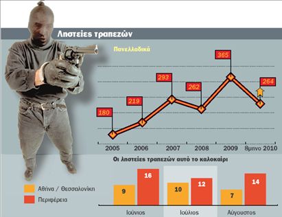 Το κύμα ληστειών μάλιστα εμφανίζει τέτοια έξαρση στην περιφέρεια, έτσι που οι αρχές φοβούνται ότι ως το τέλος της χρονιάς μπορεί να «σπάσει» ξανά το περυσινό πρωτόγνωρο ρεκόρ των 365 ληστειών τραπεζών σε όλη τη χώρα. Ηδη κατά το πρώτο οκτάμηνο του 2010 το οποίο συμπληρώνεται σε λίγες ημέρες έχουν σημειωθεί 264 ληστείες, αριθμός που βρίσκεται πολύ κοντά στις 293 του 2007.