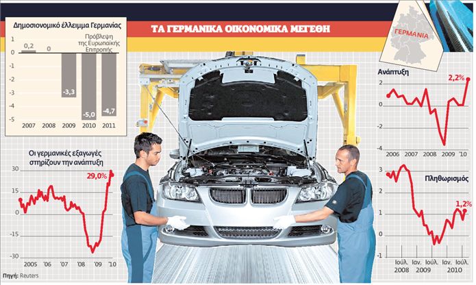 Ο ενθουσιασμός δεν είναι αδικαιολόγητος. Η αύξηση του ακαθάριστου εισοδήματος κατά 2,2% το β΄ τρίμηνο του 2010 (το μεγαλύτερο ποσοστό μετά την ένωση της χώρας!) έθεσε απροσδόκητα τη Γερμανία επικεφαλής στους ρυθμούς ανάπτυξης των μεγάλων οικονομιών της Δύσης- πιο μπροστά από τις Ηνωμένες Πολιτείες ή τη Μεγάλη Βρετανία. « Ξαφνικάη Γερμανία παίρνει στροφές όπως η Κίνα! » σχολίασε εμφατικά η εβδομαδιαία εφημερίδα «Die Ζeit».