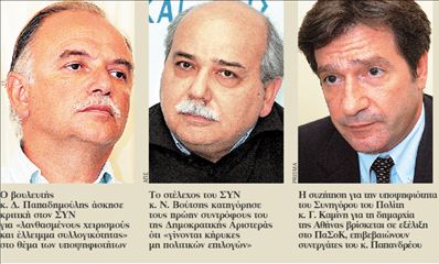 Εν τω μεταξύ, ο βουλευτής του ΣΥΡΙΖΑ κ. Δ. Παπαδημούλης άσκησε κριτική στο κόμμα του για «λανθασμένους χειρισμούς, καθυστερήσεις και έλλειμμα συλλογικότητας» στο θέμα των υποψηφιοτήτων με αιχμή την προσέγγιση με τον σοσιαλιστικό χώρο του ΠαΣοΚ. «Αν κάτι πρέπει να κάνει η δική μας Αριστερά, είναι να ανταποκριθεί στην ανάγκη να σχηματιστεί ένα ευρύ αντινεοφιλελεύθερο μέτωπο που να εκφράζει όχι μόνο τις δυνάμεις του ΣΥΝ, του ΣΥΡΙΖΑ, των Οικολόγων Πράσινων, της Δημοκρατικής Αριστεράς και τους διαφωνούντες του ΠαΣοΚ, αλλά και ένα ευρύτερο κομμάτι μέσα στην κοινωνία». Δήλωσε μάλιστα ότι «η οικοδόμηση ισχυρών συσπειρώσεων απαιτεί προσεκτικές κινήσεις, σοβαρότητα,ευθύνη,περισσότερα να κάνεις και λιγότερα να λες», διατυπώνοντας αιχμές για χειρισμούς που έγιναν με τα γνωστά άδοξα αποτελέσματα.