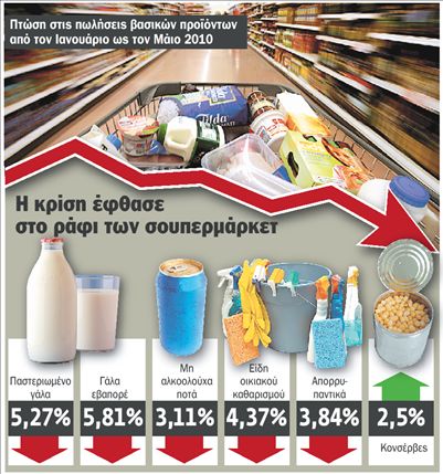 Είναι απολύτως ενδεικτικά τα στοιχεία της ΙRΙ που αφορούν την εξέλιξη της κατανάλωσης στο πεντάμηνο Ιανουαρίου- Μαΐου 2010. Η πορεία πολλών προϊόντων, και μάλιστα αυτών που συγκροτούν το βασικό τμήμα της διατροφής, στα ράφια και στα ψυγεία των σουπερμάρκετ είναι απογοητευτική. Κατ΄ αρχήν το παστεριωμένο γάλα στο προαναφερθέν διάστημα έχασε πωλήσεις περίπου 6,5 εκατ. ευρώ, δηλαδή το 5,27% σε σχέση με το αντίστοιχο διάστημα του 2009, το γάλα εβαπορέ είχε απώλειες 5,81% και συνολικά η κατηγορία των γαλακτοκομικών προϊόντων απώλεσε περί τα 13 εκατ. ευρώ. Επίσης η κατηγορία των μη αλκοολούχων ποτών έχασε το 3,11% των πωλήσεών της, με τους φυσικούς χυμούς και τον ελληνικό καφέ να έχουν καταγράψει τη μεγαλύτερη πτώση. Τα είδη οικιακού καθαρισμού έχασαν πωλήσεις 5 εκατ. ευρώ σημειώνοντας απώλεια 4,37%, τα απορρυπαντικά περίπου 4 εκατ. ευρώ, ποσοστιαίως 3,84%, διάφορα υλικά μαγειρικής (αλάτι, αλεύρι, μαγιονέζα κ.λπ.) έχασαν περίπου 6 εκατ. ευρώ, ενώ από τα αμυλούχα προϊόντα μόνον οι πωλήσεις των οσπρίων «αντιστάθηκαν». Παραδόξως αύξηση σημείωσαν οι πωλήσεις κονσερβοποιημένων τροφίμων, περί το 2,5%, όπως και διάφορα σνακ, που κέρδισαν πωλήσεις περίπου 2,5 εκατ. ευρώ.
