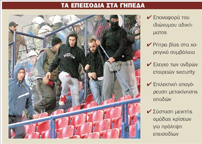 Διαπιστώθηκε, τέλος, ότι η βία πλέον δεν στρέφεται μόνο μεταξύ οπαδών αντίπαλων ομάδων. Το περιστατικό με τον ξυλοδαρμό του Ντούσαν Μπάγεβιτς, οι καταστροφές στο γήπεδο του Πανιωνίου αλλά και τα συνθήματα των οπαδών του Παναθηναϊκού κατά της διοίκησης της ομάδας τους στο πρόσφατο φιλικό με την Τζένοα αποτελούν εκφάνσεις αυτής της νέας τακτικής των οπαδών, που πρέπει να αντιμετωπιστεί με διαφορετικά μέτρα.