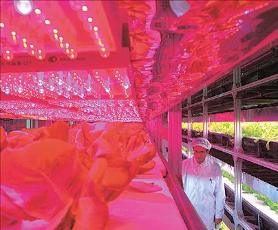 Κινέζος εργάτης επιθεωρεί μαρούλια στο πρώτο υπερσύγχρονο φυτώριο φρούτων και λαχανικών, στα περίχωρα του Πεκίνου. Τα βιολογικής καλλιέργειας ζαρζαβατικά μεγαλώνουν σε υδροπονικό διάλυμα κάτω από τεχνητό φως, η διάρκεια και η ένταση του οποίου ελέγχονται από κεντρικό υπολογιστή: στόχος, η δημιουργία 15 εκατομμυρίων φυτών τον χρόνο, που στη συνέχεια θα μεταφυτεύονται στους... συμβατικούς αγρούς της Λαϊκής Κίνας.