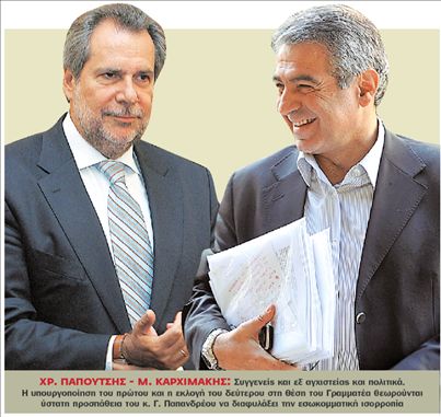 εκ πρώτης όψεως ασφαλή τακτική εξισορρόπησης:αποφασίστηκε η υπουργοποίηση του κ. Χρ. Παπουτσή, ο οποίος εξακολουθεί να διαθέτει ισχυρά εσωκομματικά ερείσματα και ταυτόχρονα η τοποθέτηση του κ. Μ. Καρχιμάκη, ενός στελέχους που είναι ενταγμένο στον κύκλο επιρροής του, στη θέση του Γραμματέα.