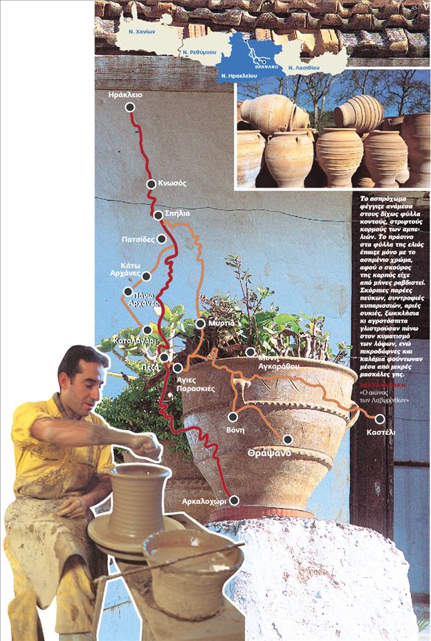 Ο Κωστής Χουλάκης, ένας από τους γητευτές του πηλού εδώ στο Θραψανό, από οικογένεια αγγειοπλαστών, γνωρίζει την ηλικία της τέχνης του. Τίποτε δεν τον εμποδίζει να πιστεύει ότι δουλεύει όπως και εκείνοι που έκαναν τα πιθάρια της Κνωσού. Εξάλλου όλα μπλέκονται σε έναν μαγικό ιστό, σαν να μην υπήρχε απόσταση χιλιάδων ετών. Να, παρακάτω στον Γαλατά υπάρχει το εξοχικό του Μίνωα, λέει. Το χώμα είναι το ίδιο, όπως και το νερό. Μόνο που οι φούρνοι για το ψήσιμο των σκευών δεν καίνε ξύλα, αλλά γκάζι. Βέβαια λειτουργούν ακόμη και παραδοσιακοί. Οσο για τον τροχό: «Αλλη τέχνη,βρε παιδί μου,ο παραδοσιακός με το πόδι και άλλη ο ηλεκτρικός»…