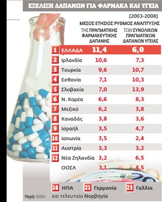 Η Ελλάδα μάλιστα καθίσταται «πρωταθλήτρια» στην αύξηση της φαρμακευτικής δαπάνης, καθώς εμφανίζεται να διαθέτει τον υψηλότερο μέσο ετήσιο ρυθμό αύξησης της πραγματικής φαρμακευτικής δαπάνης, ο οποίος είναι σχεδόν τετραπλάσιος(!) από τον μέσο όρο του ΟΟΣΑ (11,4% προς 3,1%). Ακόμη, η χώρα μας βρίσκεται στην τρίτη υψηλότερη θέση στις δαπάνες «από την τσέπη», δηλαδή τις απευθείας άμεσες πληρωμές στο συνολικό κόστος της υγείας, με 34,5% επί των συνολικών δαπανών υγείας, ποσοστό σχεδόν διπλάσιο από τον μέσο όρο του ΟΟΣΑ (19,2%). Σε μονάδες αγοραστικής δύναμης η χώρα μας «κατέκτησε» την τρίτη θέση στην κατά κεφαλήν φαρμακευτική δαπάνη στον ΟΟΣΑ με 668 δολάρια (σε τιμές 2008), όταν ο μέσος όρος κυμαίνεται στα 449.